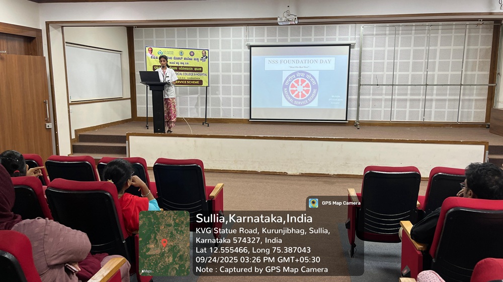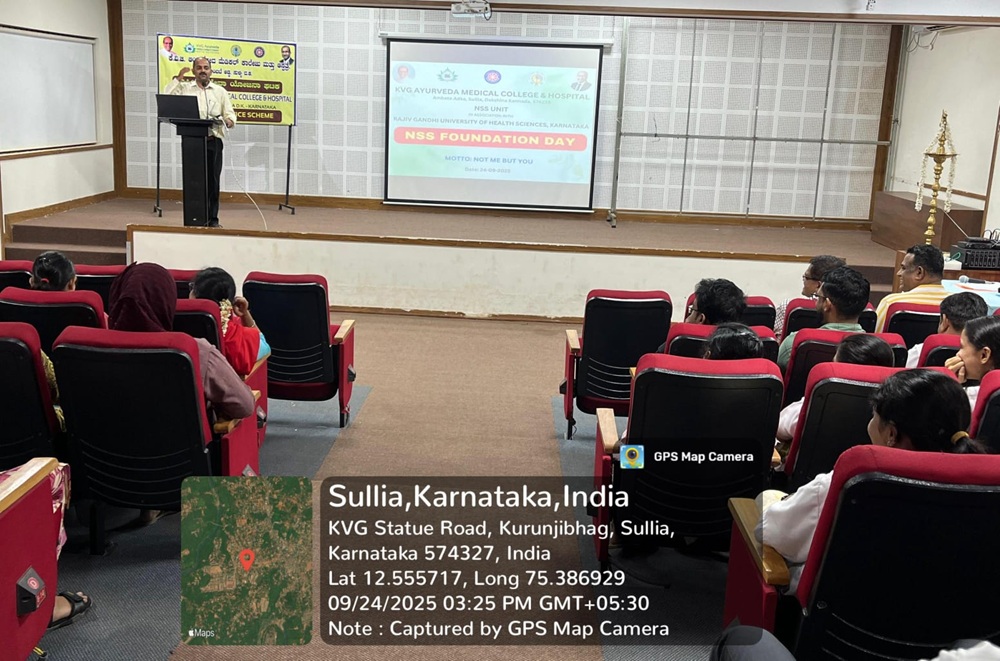 On account of “NSS Foundation Day”, NSS unit of our college organized a stage program on 24.09.2025 at KVG Ayurveda Medical College & Hospital Sullia. The program was inaugurated by Dr. Ashok K, Prof. & HOD,Dept. of Prasuti Tantra Evam Stree Roga. NSS program officer Dr. Pramoda P.A. was given a keynote address. A presentation had been done by Ms. Brunda Gowda regarding NSS contributions to the society. In this program teaching staff, non- teaching staff, PG scholars, students & NSS volunteers of our college were actively participated.